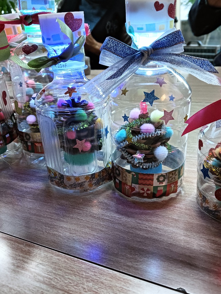 今回の作品作りは、松ぼっくりでクリスマスツリーをペットボトルの中に入れて、LDEライトをつけた作品です